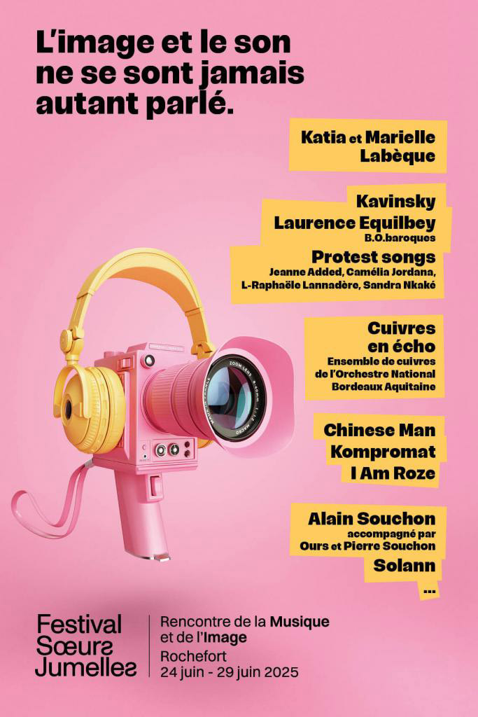 Depuis 2021 à Rochefort, berceau des Demoiselles de Rochefort, le Festival Sœurs Jumelles affirme son manifeste : unir musique et image pour faire naître l’innovation et l’émotion. Porté par l’histoire de Jacques Demy et Michel Legrand, il s’articule autour de deux piliers — concerts variés et projections immersives — et propose deux parcours complémentaires : un volet grand public pour découvrir et vibrer, un volet professionnel pour échanger et coproduire. Le tout se déroule dans le cadre exceptionnel de Rochefort : Corderie Royale, Église Saint‑Louis, Cinéma Apollo 8 et théâtre de la Coupe d’Or.